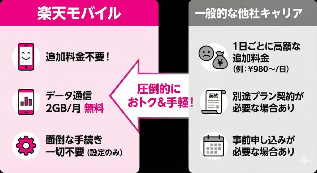 他社のプランでは、海外利用のために1日あたり約1,000円から3,000円の追加料金が発生するケースが一般的です。楽天モバイルならこの追加コストがゼロになるため、浮いたお金を現地の食事やアクティビティに回せます。