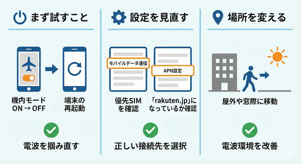 最も効果的なのは、やはり「機内モードのオン・オフ」と「端末の再起動」です。スマートフォンは長時間稼働しているとシステムが不安定になることがあり、再起動によってメモリがリフレッシュされ、通信機能が正常に戻ります。
