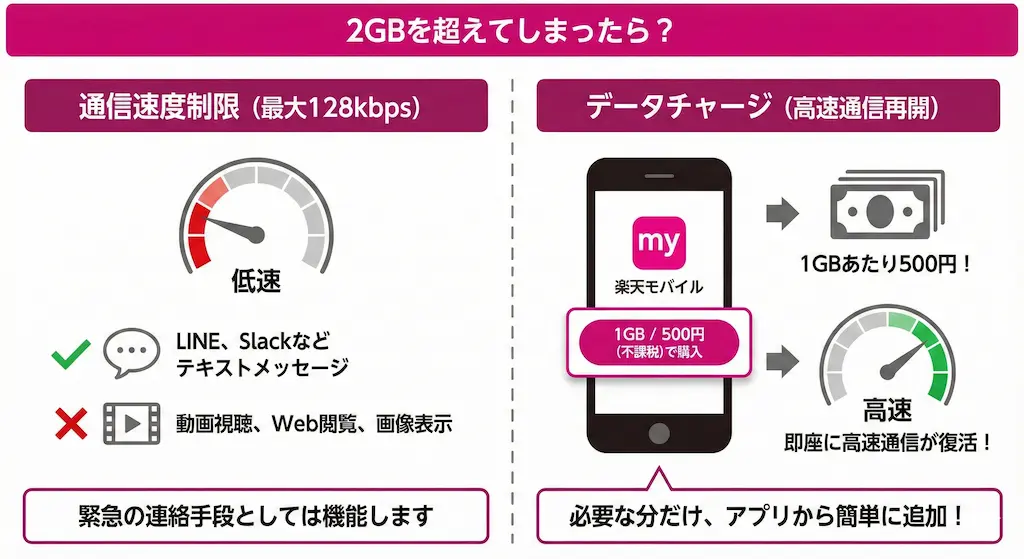 高速通信を再開したい場合、データを追加購入(チャージ)できます。楽天モバイルの海外データチャージは「1GBあたり500円(不課税)」という破格の安さです。