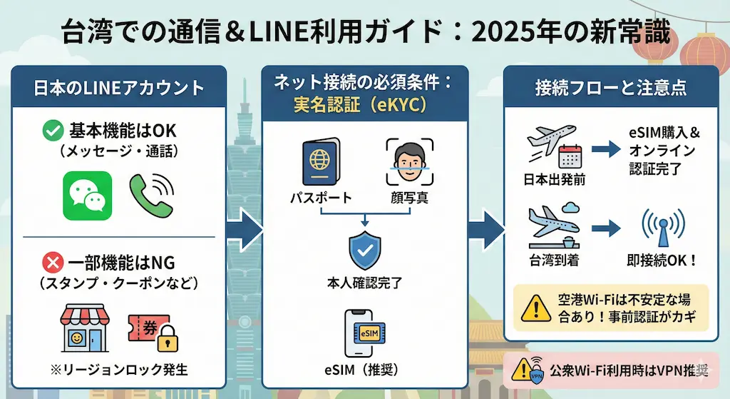 2025年現在、台湾でプリペイドSIM(eSIM含む)を利用するには、政府が義務付けた「実名認証(eKYC)」を避けて通れません。かつてのようにSIMを挿すだけで使える時代は終わり、パスポート情報の登録と顔写真による厳格な本人確認が必要です。