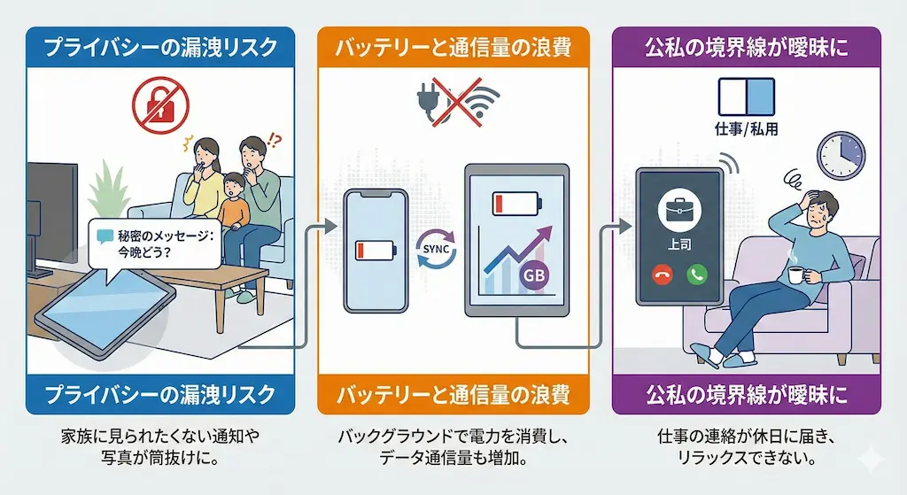 iPhoneとiPadの同期は本当に必要なのか、一度立ち止まって考えるべきです。私は以前、家族団らんの最中にiPadへ仕事の緊急連絡が通知され、その場の空気を凍らせてしまった苦い経験があります。