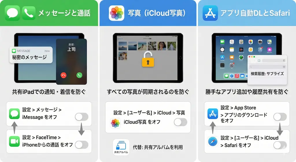 メッセージと通話の同期は、共有iPadでは百害あって一利なしです。これらは真っ先に設定を変更すべき項目です。