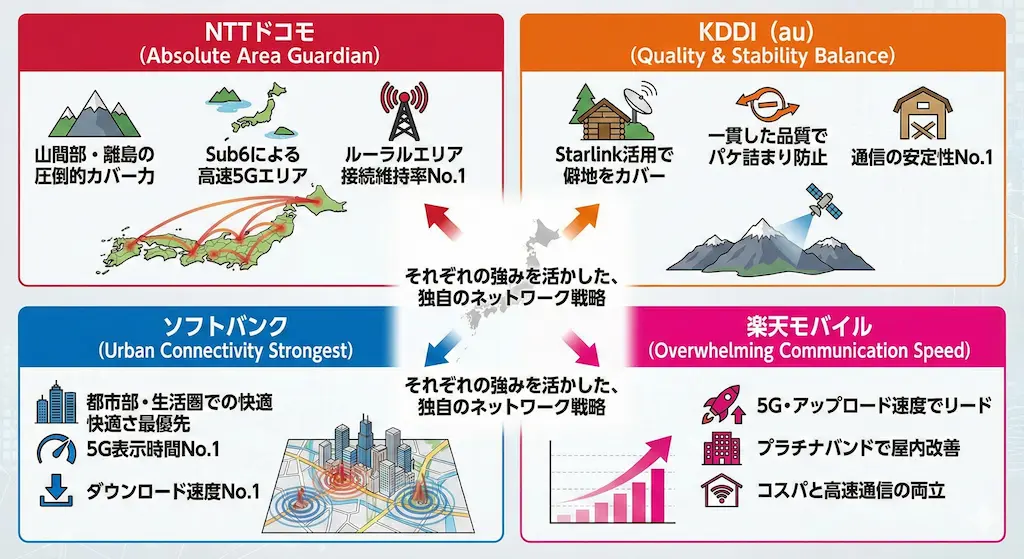 NTTドコモは山間部や海上航路における強さが圧倒的で、ルーラルエリア(田舎)での接続維持率はNo.1です。KDDIはStarlinkの活用で山岳地帯のカバーを強化しており、ドコモに肉薄しています。