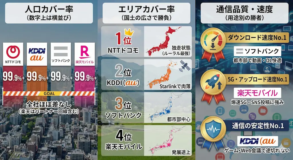 | 1 | NTTドコモ | 99.9%+ | 僻地含む実質全域をカバー |