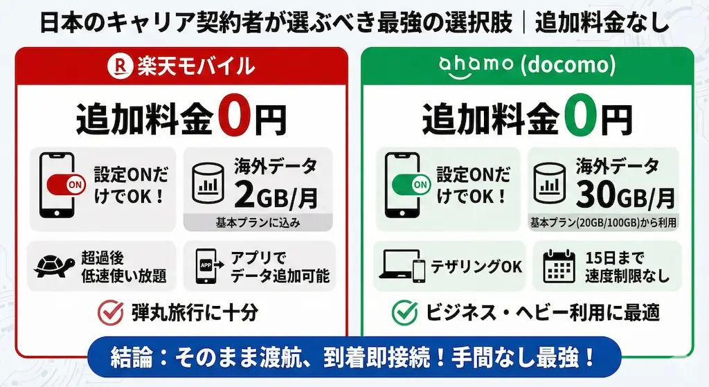 もしあなたが特定の日本の携帯キャリアを使っているなら、わざわざ新しい通信手段を買う必要はありません。2026年現在、追加料金なしで海外利用できるプランが標準化しています。