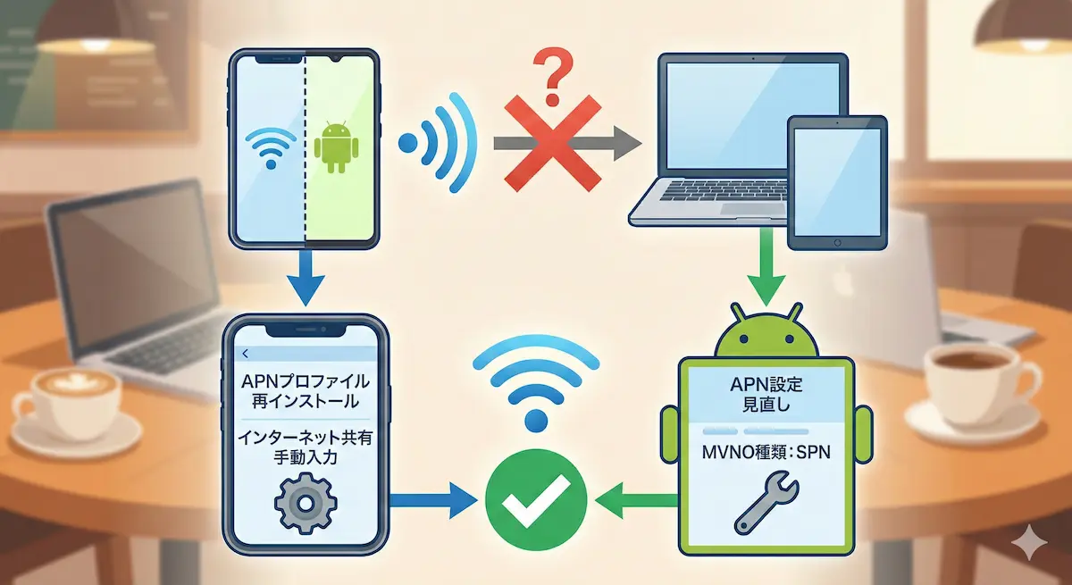 大手キャリアのように「テザリングオプションへの加入忘れ」が原因で繋がらないということはありません。そのため、繋がらない場合は契約内容ではなく、お手持ちの端末の設定や相性に原因があると判断できます。