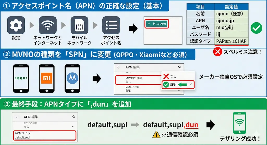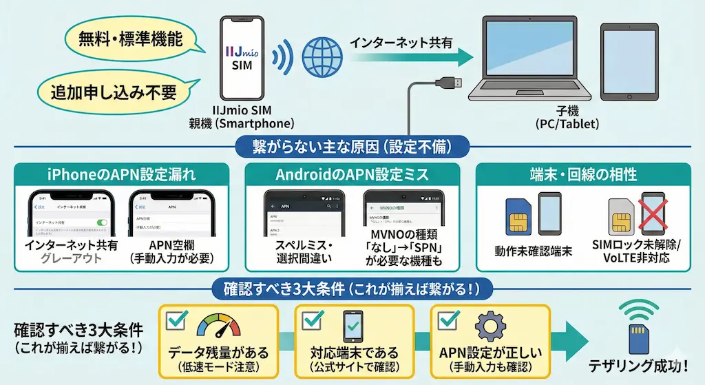 IIJmioでテザリングができない問題は、その多くが端末側の設定を見直すことで解決します。最後に、今回の重要ポイントを整理します。