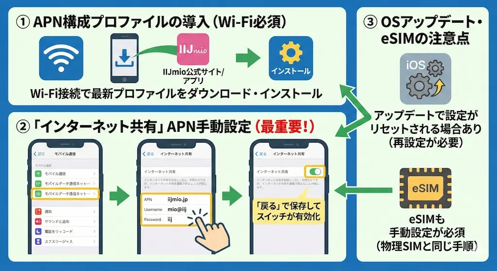 iPhoneユーザーの方は、APN構成プロファイルの確認に加え、「インターネット共有」欄へのAPN手動入力を必ず行ってください。ここが空欄になっていることが、トラブルの最大の原因です。