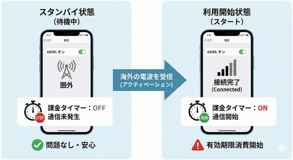 多くの人が「スイッチをオンにする=即課金開始」と誤解していますが、実際はそうではありません。eSIMの仕組み上、回線をオンにすることと、実際に通信が開始されて有効期限が減ることは別のプロセスです。