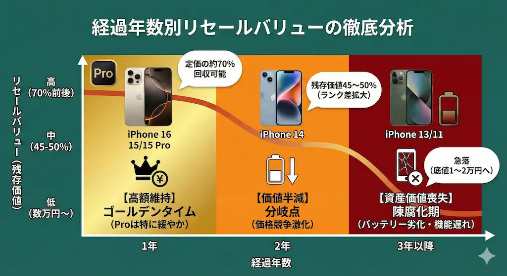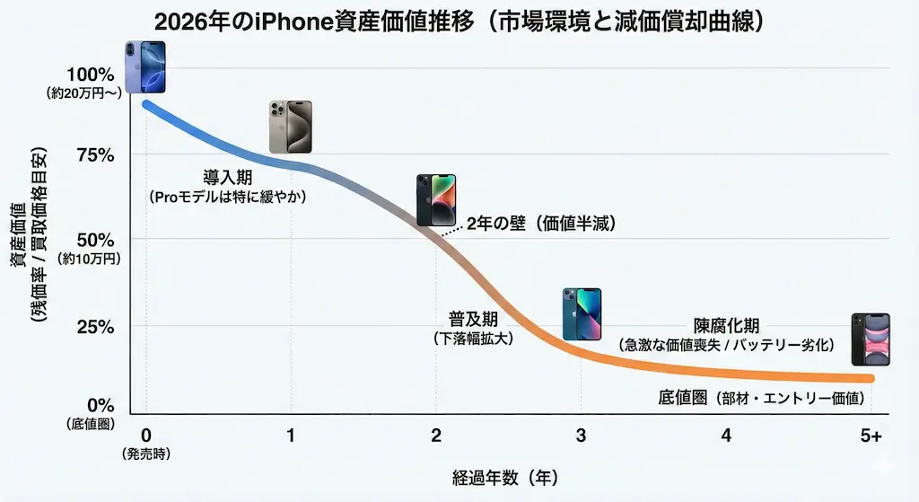 理想の買い替え頻度を算出するためには、まず手持ちのiPhoneがいつ売れるのかという出口戦略を描く必要があります。2026年1月時点での買取相場データを基に、経過年数ごとの残存価値を分析しました。