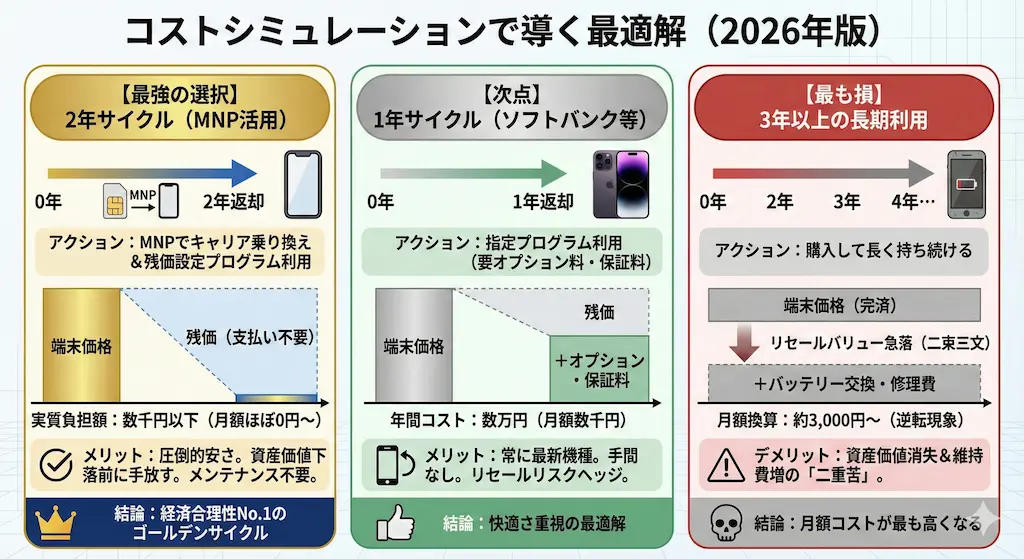 以上の市場データとキャリアプログラムの特性を統合し、ユーザーの利用期間別にトータルコストをシミュレーションします。2026年現在において、どのサイクルが最も財布に優しいのかを明らかにします。