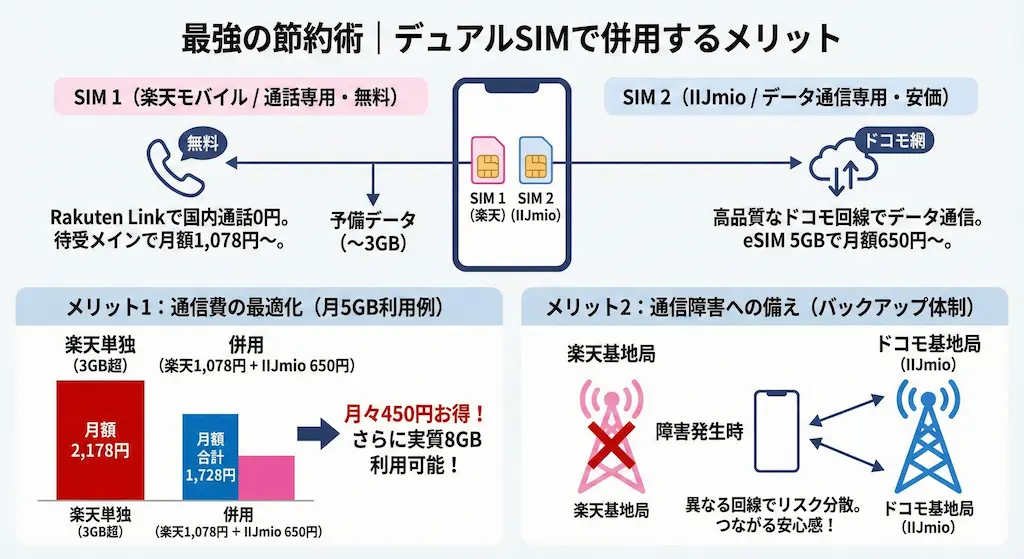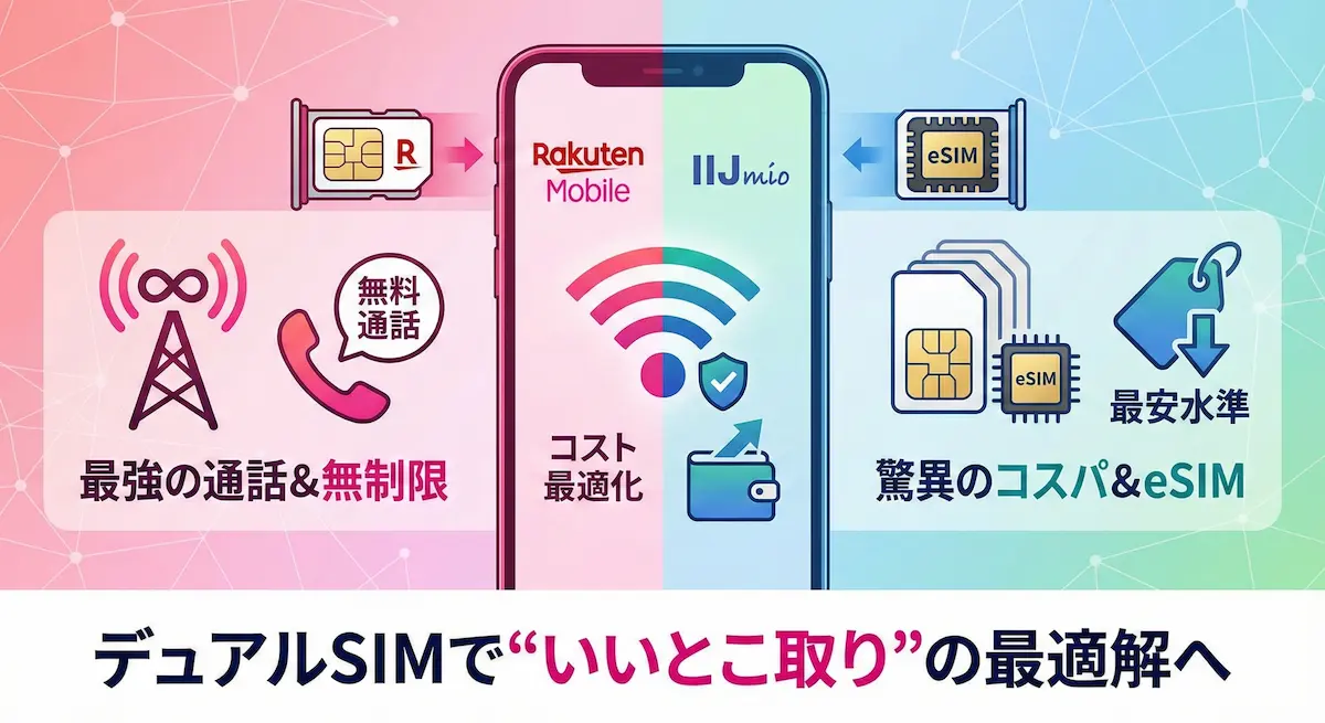 月々の通信費を抑えつつ、通話もデータも賢く使いたいなら、楽天モバイルとIIJmioの併用がベストプラクティスです。デュアルSIMを活用して、快適なスマホライフを手に入れてください。