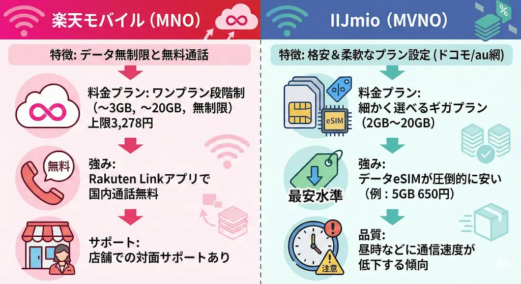 ここでは、MNOである楽天モバイルとMVNOの代表格であるIIJmioの基本的な特徴を解説します。両社の違いを理解することが、最適なプラン選びの第一歩です。