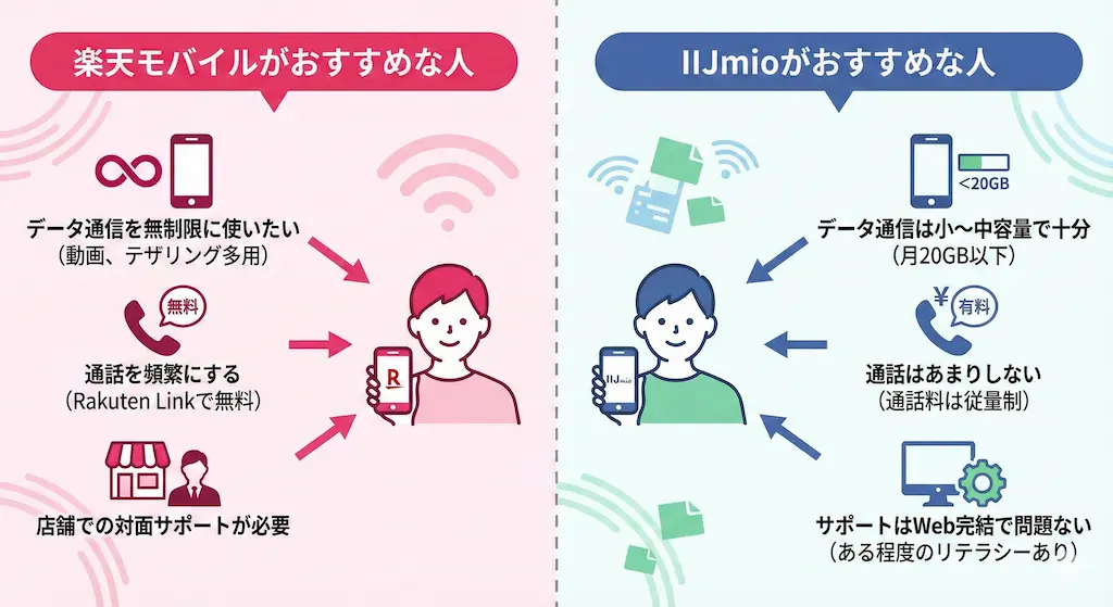楽天モバイルとIIJmioは、それぞれ異なる強みを持っています。どちらか一つを選ぶのも良いですが、組み合わせることでさらに便利に使えます。