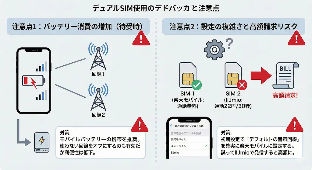 非常に便利なデュアルSIM運用ですが、いくつか注意すべき点もあります。導入前にデメリットもしっかりと把握しておくべきです。