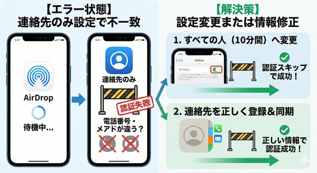 もっとも手軽で確実な解決策は、受信側の設定を一時的に「すべての人」に変更することです。連絡先の照合プロセスをスキップするため、認証エラーを物理的に回避できます。