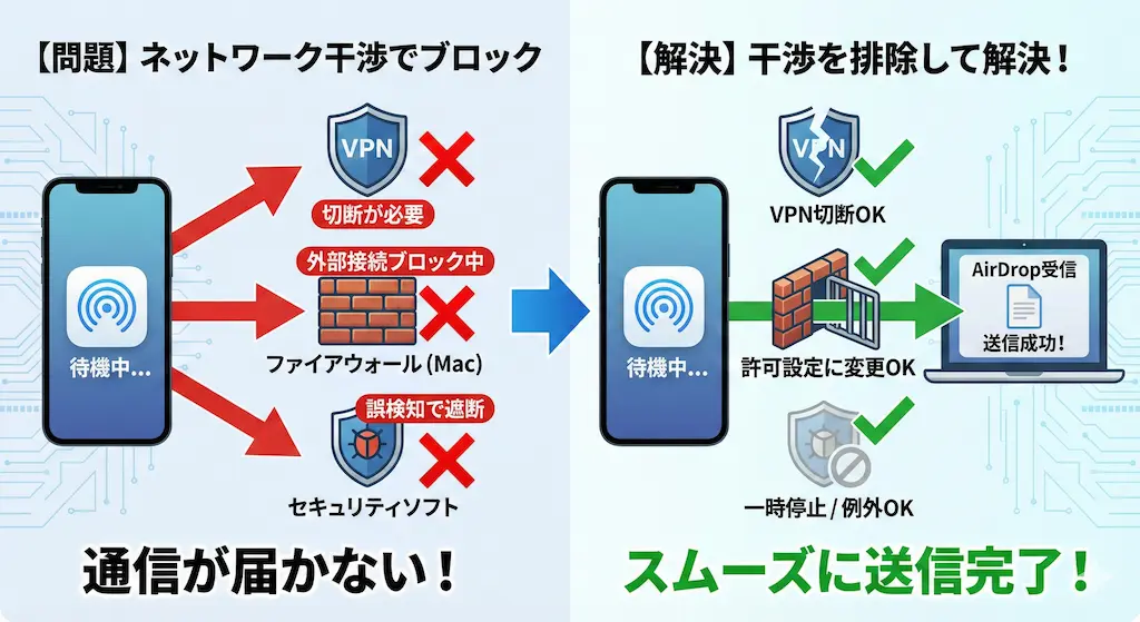 VPNを利用している場合、AirDropの通信パケットが暗号化トンネルに吸い込まれて消失する現象が発生します。AirDropはデバイス間での直接通信を想定しており、VPN経由のインターネット通信とは相性が非常に悪いです。