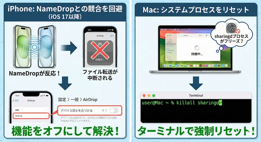 iOS 17で登場した「NameDrop」は、デバイスを近づけるだけで連絡先を交換できる優れた機能ですが、ファイル転送と競合することがあります。ファイルを送りたいのに連絡先交換の画面が優先され、転送が「待機中」のまま止まってしまうのです。