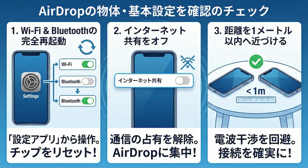AirDropが「待機中」で止まってしまう問題は、複数の要因が絡み合って発生します。原因を一つずつ切り分けて対処することで、確実に解決へと導くことができます。