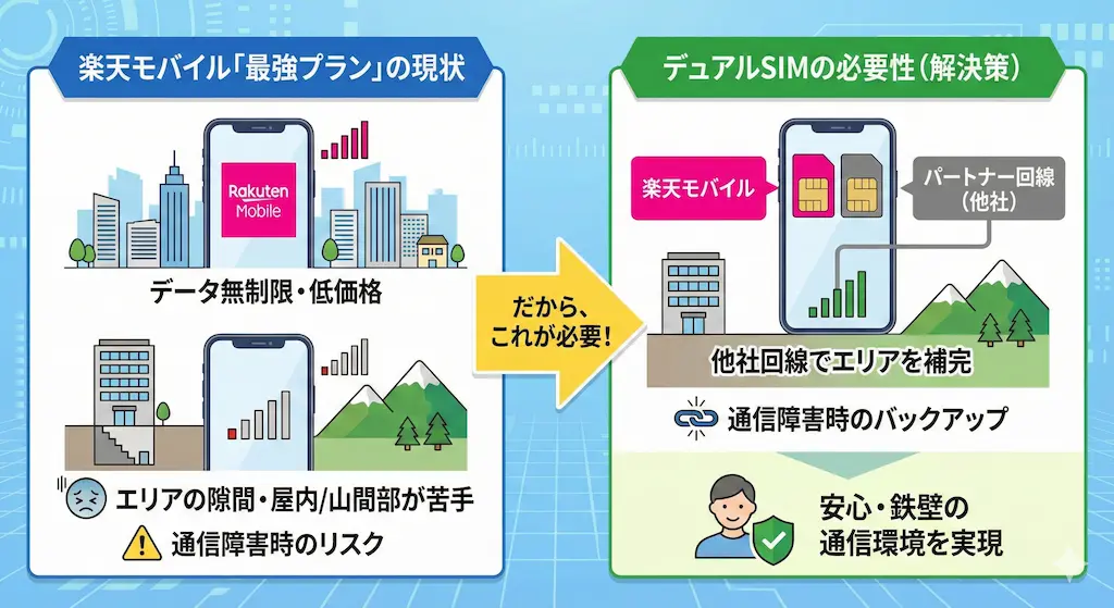 楽天モバイルは単独でも十分に戦えるキャリアへと成長しました。しかし、完璧な通信インフラなど存在しない以上、リスクヘッジは必須です。