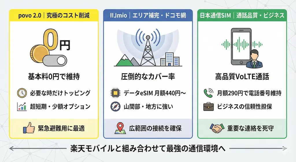完全に自立したネットワークを持つ他社SIMを組み合わせることで、楽天モバイルのエリア変動に左右されない環境を構築できます。